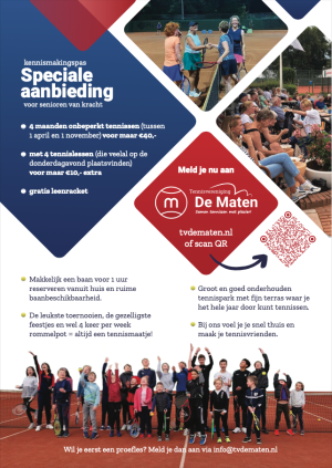 Voor slechts € 40,- bestel je een kennismakingspas en ben je geen KNLTB-lid, speel je geen toernooien en competitie. Wel kun je meedoen aan de eigen tennisactiviteiten van onze vereniging: Clubkampioenschappen, Startersclinics en Wintertennis. In de vierde maand of eerder maak je de keuze om standaard lid te worden. Let op: deze pas is alleen voor nieuwe leden die de laatste drie jaar geen lid geweest zijn van De Maten.